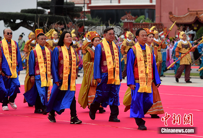 圖為5月12日,吳成典(右二)在福建湄洲島參加癸卯年紀念媽祖誕辰1063周年大會暨春祭大典活動。 中新社記者 呂明 攝