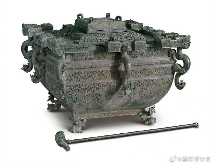 比如人們熟悉的“青銅冰鑒”,它是由一個方鑒和一件方尊缶組成的青銅套器,與之配套的還有一把長柄青銅勺。從造型上看,該青銅冰鑒結構精巧,體態厚重。