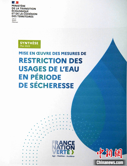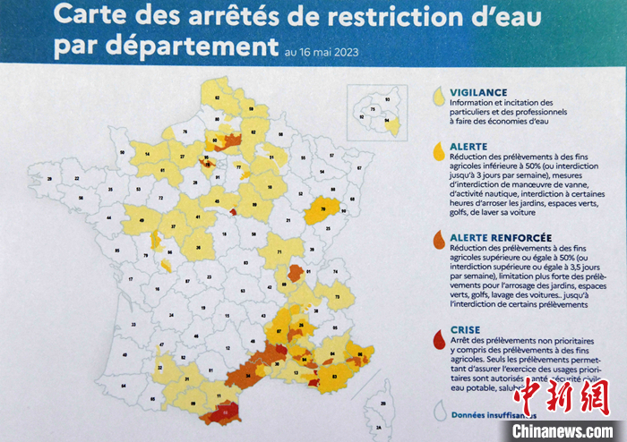 法國(guó)官方本周發(fā)表的一份最新報(bào)告顯示,法國(guó)今年炎熱干旱和水資源短缺問題可能比去年更加嚴(yán)重。報(bào)告公布的地圖標(biāo)明了需要限制用水的省份。 中新社記者 李洋 攝