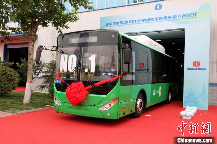 5月20日,吉爾吉斯斯坦1000臺中通客車首批車輛下線儀式在山東聊城舉行,圖為已經下線的10.5米中通天然氣公交車。 中新社記者 孫婷婷 攝