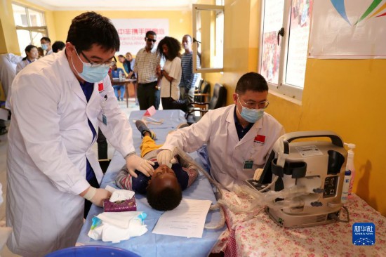 5月29日,在埃塞俄比亞首都亞的斯亞貝巴,第24批中國援埃塞醫(yī)療隊隊員為當?shù)馗@旱膬和M行體檢。新華社記者 汪平 攝