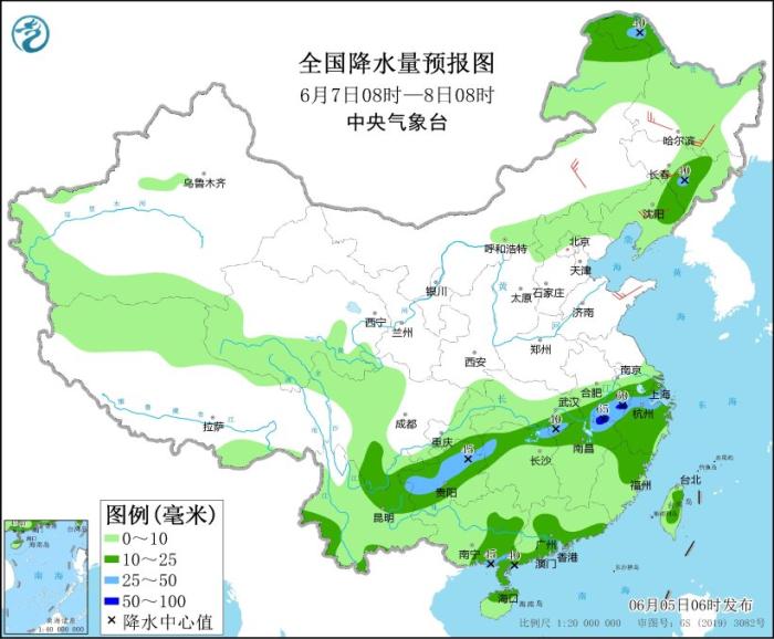 圖2 全國降水量預報圖(6月6日08時-7日08時)