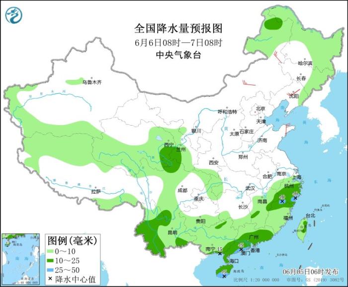 6月6日08時至7日08時,內蒙古東北部、東北地區東部和北部、青藏高原北部、甘肅中南部、江南東部和南部、西南地區大部、華南、臺灣島等地部分地區有小到中雨,局地有大雨(25~45毫米)。內蒙古中東部、東北地區南部、山東半島等地部分地區有4~5級風(見圖2)。