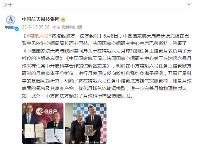 中新網6月13日電 據中國航天科技集團有限公司官方微博消息,6月8日,中國國家航天局局長張克儉在巴黎會見歐洲空間局局長阿蘇巴赫、法國國家空間研究中心主席巴蒂斯特,簽署了《中國國家航天局與歐洲空間局關于在嫦娥六號月球探測任務上搭載月表負離子分析儀的諒解備忘錄》《中國國家航天局與法國國家空間研究中心關于在嫦娥六號月球采樣任務中開展科學合作的諒解備忘錄》,明確在中方嫦娥六號任務上搭載歐方研制的月表負離子分析儀,進行月表原位反向散射和濺射負離子探測,開展行星科學的基礎問題研究;明確了將在嫦娥六號任務中搭載法方氡氣探測載荷,測量月球表面的氡氣及其衰變產物,優化月球氣體輸運模型,進一步完善月壤物理性質認知。此外,中方向法方頒發了月球科研樣品饋贈證書。