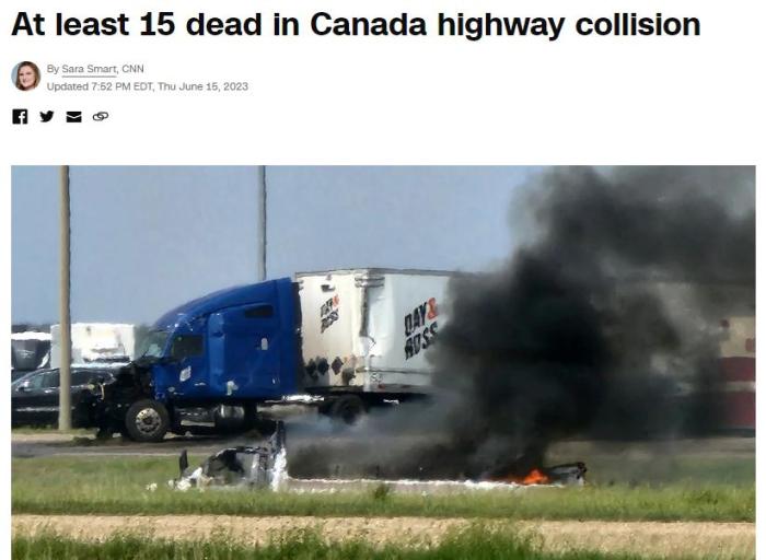 曼尼托巴省警官羅布·希爾表示,一輛載有大約25人的巴士在交叉路口與一輛半掛卡車相撞,至少15人確認死亡,另有大約10人被送往醫院。希爾補充說,巴士上大多數是老年乘客。