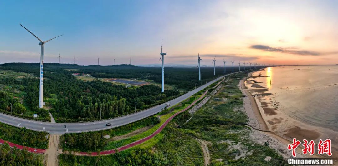 山東省榮成市北環(huán)海路,風(fēng)力發(fā)電機與沿海防護林形成一道靚麗的風(fēng)景線。近年來,中國大力推廣風(fēng)電產(chǎn)業(yè)等“綠色能源”,實現(xiàn)生態(tài)保護和可持續(xù)發(fā)展。楊志禮 攝