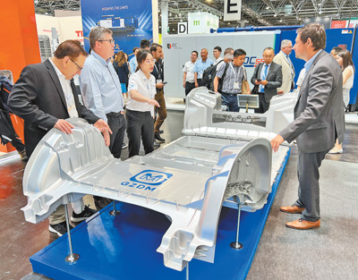 在一家中國企業展臺前,采用一體化壓鑄技術的新能源車身吸引外國客商前來咨詢。