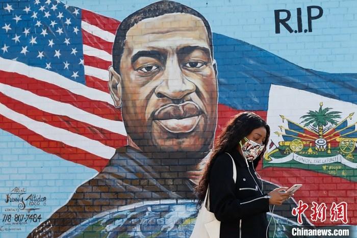 資料圖:美國紐約布魯克林區一位市民走過弗洛伊德畫像。 中新社記者 廖攀 攝