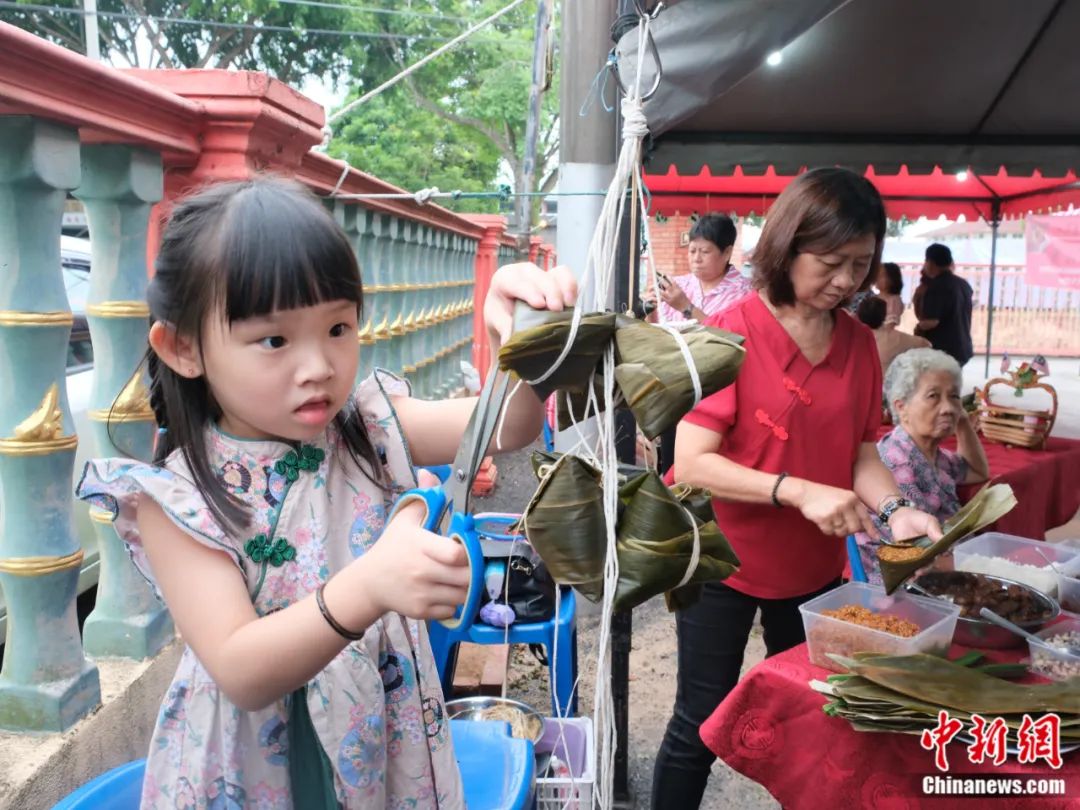 2023年6月18日,馬來西亞馬六甲舉行端午龍舟系列活動,包括游龍舟、裹粽比賽等,吸引當地各族裔民眾參與。圖為有的家庭四代同堂齊上陣。奶奶在一旁包粽子,四歲的曾馨怡小朋友給包好的粽子修剪粽葉。陳悅 攝