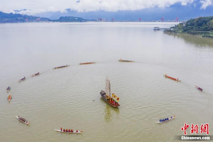 2021年10月,中國龍舟爭霸賽在湖北秭歸縣徐家沖港灣國家級龍舟訓練基地舉行,圖為龍舟游江儀式。聶爽 攝