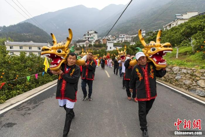 2022年3月4日,在秭歸縣歸州鎮萬古寺村,當地村民抬龍頭下水。聶爽 攝