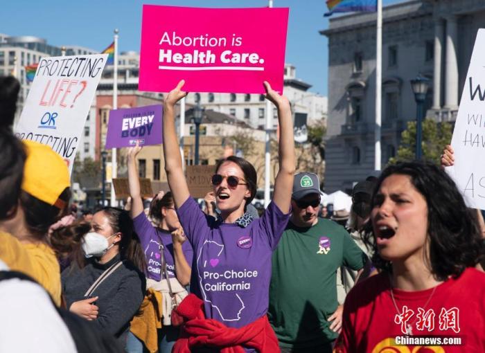 資料圖:當地時間2022年6月24日,美國舊金山民眾聚集在市政廳前,抗議美聯邦最高法院推翻“羅訴韋德案”。中新社記者 劉關關 攝