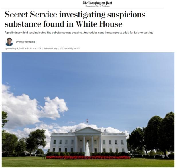 中新網(wǎng)7月4日電 據(jù)美國《華盛頓郵報(bào)》4日報(bào)道,當(dāng)?shù)貢r(shí)間2日晚,美國特勤局在白宮內(nèi)發(fā)現(xiàn)了一些可疑白色粉末狀物質(zhì),經(jīng)初步鑒定,其中含有可卡因成分。