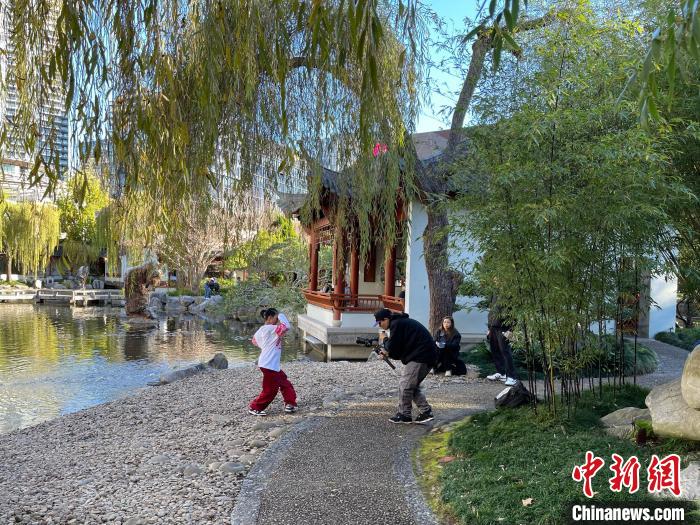 在湖邊,中國戲曲元素結合英文說唱的音樂吸引了游客們駐足。在悉尼從事汽修工作十余年的華人楊女士帶著兒子艾迪在湖邊拍攝音樂短視頻。穿著印有紅色京劇臉譜衛衣的艾迪伴著動感音樂起舞。“我非常喜歡這里中西結合的感覺。希望在公共場合拍攝能培養孩子的自信心。”楊女士說。