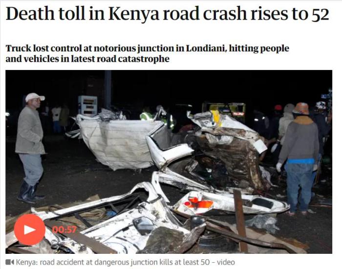 穆爾科門在一份聲明中表示,死亡人數為52人,另有32人受傷,并補充說,肇事卡車的注冊地是盧旺達。肯尼亞媒體報道稱,肇事車輛的司機已經死亡,但法新社稱,這一消息無法立即得到證實。
