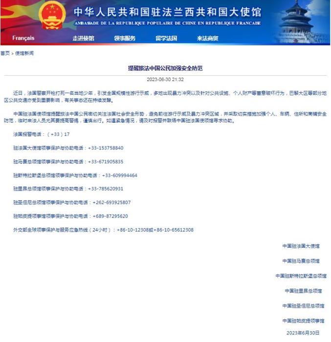 中國駐法國大使館表示,近日,法國警察開槍打死一名當地少年,引發全國規模性游行示威,多地出現暴力沖突以及針對公共設施、個人財產等蓄意破壞行為,巴黎大區等部分地區公共交通亦受到重要影響,有關事態還在持續發酵。