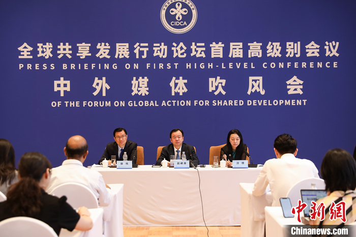 7月4日,全球共享發展行動論壇首屆高級別會議中外媒體吹風會在北京舉行。針對有觀點認為西方國家與發展中國家看待全球發展倡議的視角不同,對全球發展倡議的評價也不同,中國國家國際發展合作署副署長趙峰濤(中)在北京回應指出,全球發展倡議面向全球,無分南北。倡議是開放、包容的,不能用狹隘的地緣政治、冷戰思維、陣營對抗理念來解讀。 中新社記者 趙雋 攝
