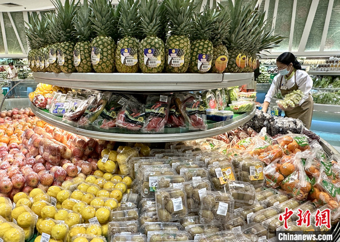 圖為菲律賓大馬尼拉地區馬卡蒂市,超市工作人員在整理水果。 中新社記者 張興龍 攝