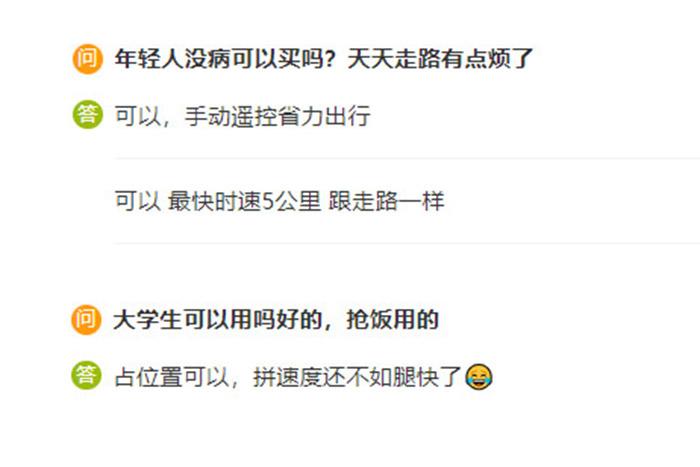 中新財(cái)經(jīng)注意到,在電商平臺(tái)上電動(dòng)輪椅的問(wèn)答區(qū),不少消費(fèi)者都對(duì)電動(dòng)輪椅展現(xiàn)出了濃厚的興趣,“年輕人沒(méi)病可以買嗎?天天走路有點(diǎn)煩了?!薄按髮W(xué)生可以用嗎?”“食堂搶飯用!神器?!薄澳贻p人也可以用,省力出行?!?/p>