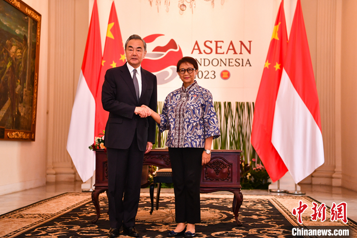 當地時間7月12日,中央外辦主任王毅在雅加達會見印尼外長蕾特諾。 中新社發 徐欽 攝
