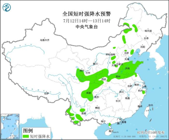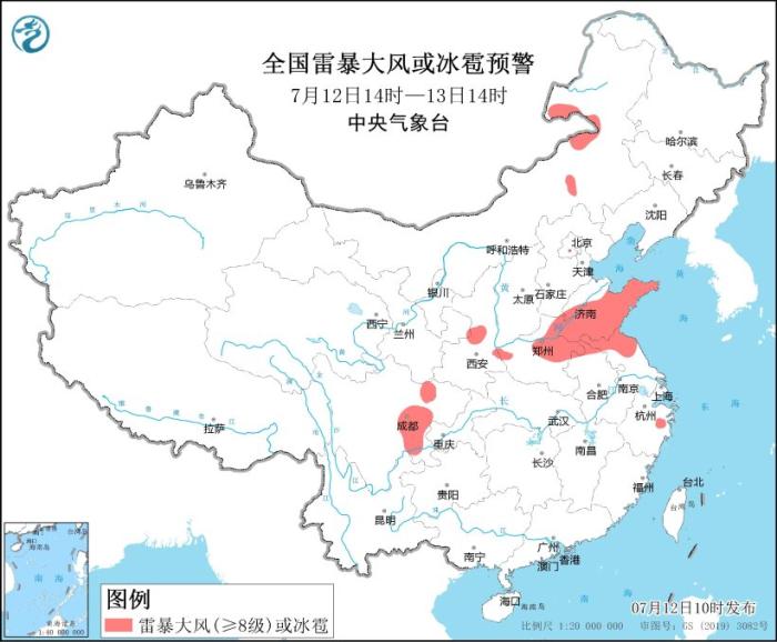 中新網7月12日電 據中央氣象臺網站消息,中央氣象臺7月12日10時繼續發布強對流天氣藍色預警:預計7月12日14時至13日14時,內蒙古中東部、陜西中部、山東大部、河南東部、安徽北部、江蘇北部、四川盆地中西部等地的部分地區將有8-10級雷暴大風或冰雹天氣;內蒙古中東部、青海東部、甘肅東部和南部、陜西中南部、山西中北部、河北南部、山東、河南中北部、安徽北部、江蘇北部、四川盆地西部、云南西南部等地的部分地區將有短時強降水天氣,小時雨量30-50毫米,局地可達60毫米以上。
