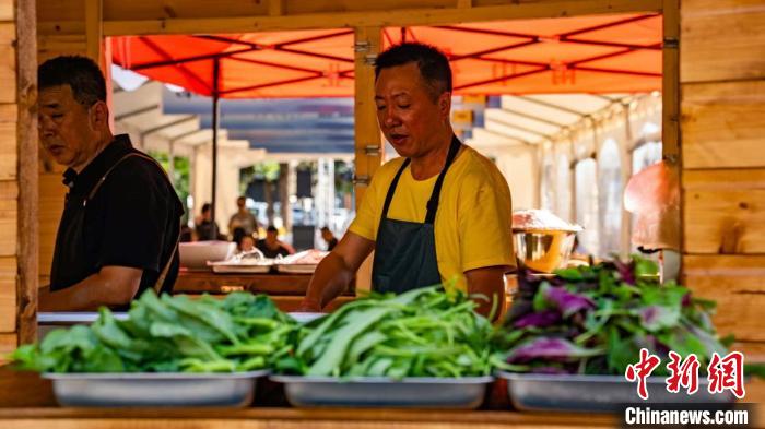 他告訴記者:“美食街占地3000平方米,12間木制廚房圍成一圈,中間是顧客就餐的區域,白色雨棚下有160余個座位。木屋的設計構思巧妙,我們將屋頂設計成傾斜的,廊檐向外延伸80厘米,方便雨水流下來,窗戶設計成折疊的,放平后可以作為餐臺。”