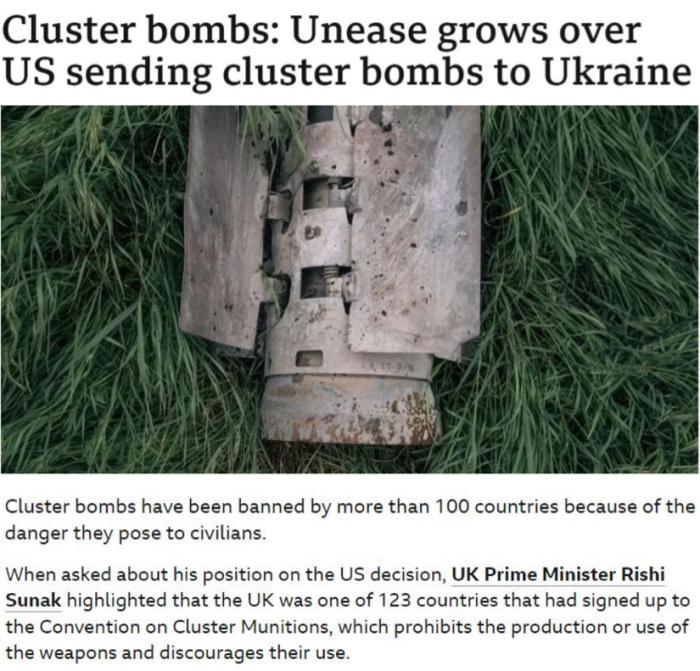 △英國廣播公司:集束彈藥因其對平民構成的長期風險,已被全世界上百個國家禁用。就連一向積極軍援烏克蘭的英國,也“不鼓勵”美國提供這種大殺傷力武器。