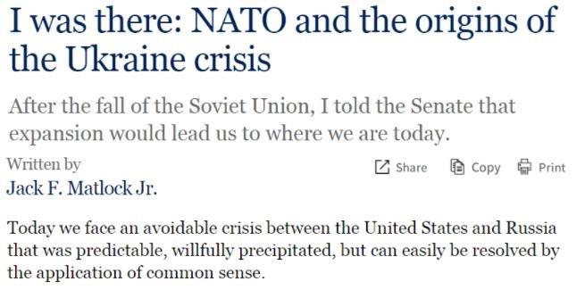 △美國昆西負責任治國研究所網站:美國最后一任駐蘇聯大使馬特洛克曾撰文感嘆,“我們今天正面臨一場原可避免的危機。這是一場可被預測、也的確曾被預測、卻又被蓄意促成的危機”。