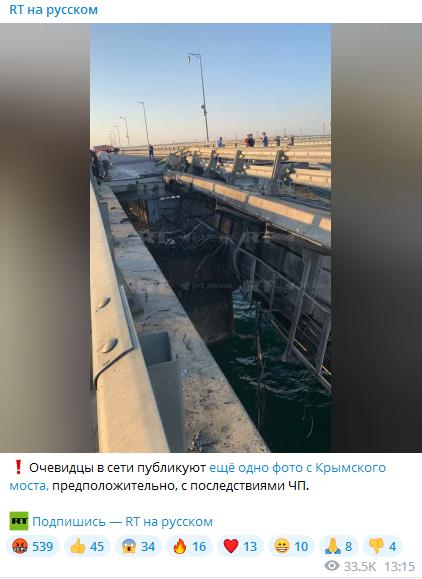 俄媒“今日俄羅斯”(RT)發布了據稱是目擊者在克里米亞大橋事件后拍攝的大橋圖片。圖片來源:RT社交媒體截圖