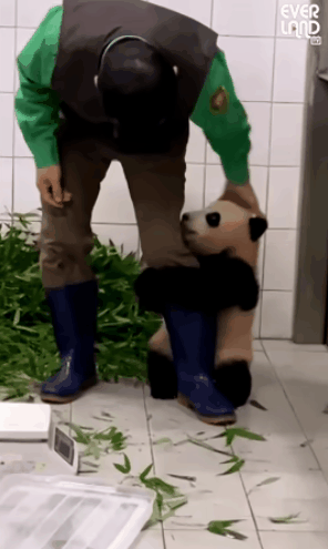 “福寶”抱著飼養員的腿撒嬌。(來源:愛寶樂園官方社交平臺賬號)