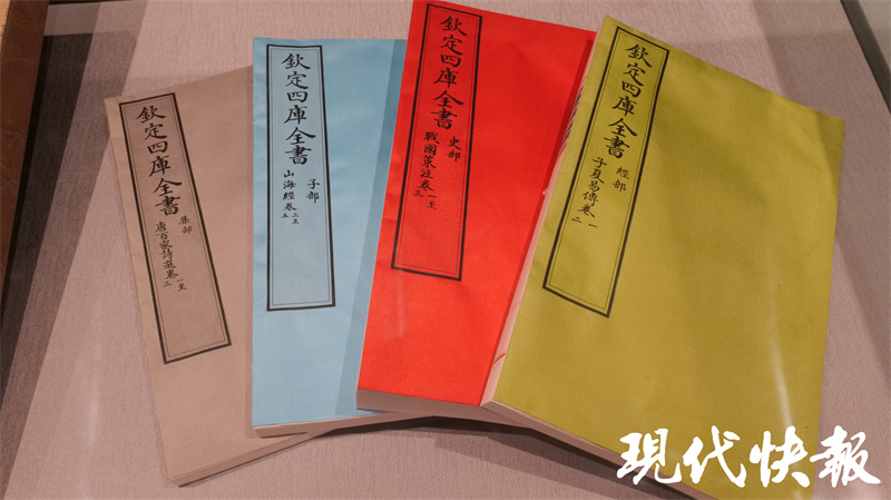 文匯閣二樓、三樓收藏了一部《四庫全書》,據了解,這部《四庫全書》是2013年由商務印書館榮譽出版、揚州國書文化公司策劃制作的原樣、原大、原色《四庫全書》復制本。它與原書大小、顏色、紙質、裝幀相同,封面仍是絹帛五色:經部綠色、史部紅色、子部月白色、集部灰黑色、總目黃色。書籍與書函、書架配套,共計木函6144個、書架128個?!端膸烊珪返难b潢非??季?,每部書籍都用兩片楠木片夾住,束以綢帶,再放入楠木盒中。盒蓋上刻有書籍的書名和所屬部類順序等信息,以便查閱。現在,游客經過預約就可以可到二樓參觀《四庫全書》部分藏書,親身感受這套浩瀚巨制。
