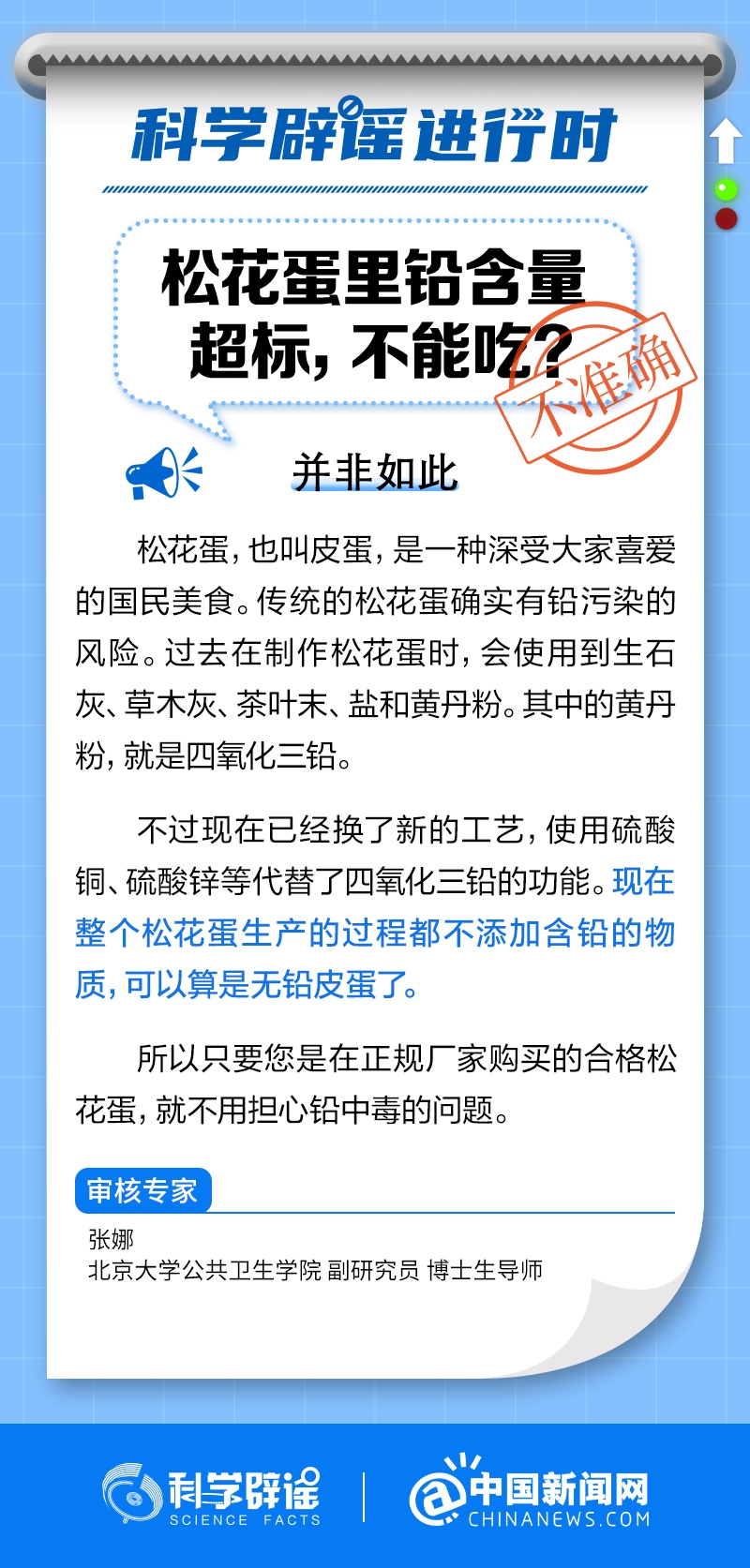 過去在制作松花蛋時,會使用到生石灰、草木灰、茶葉末、鹽和黃丹粉。其中的黃丹粉,就是四氧化三鉛。不過現在已經換了新的工藝,使用硫酸銅、硫酸鋅等代替了四氧化三鉛的功能。現在整個松花蛋生產的過程都不添加含鉛的物質,可以算是無鉛皮蛋了。(來源:科學辟謠、中國新聞網微博)