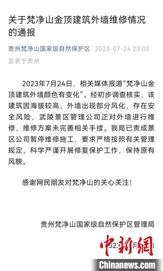 中新網貴陽7月25日電 (周燕玲)貴州梵凈山國家級自然保護區管理局24日晚對外通報稱,經初步調查核實,梵凈山金頂建筑因海拔較高,外墻出現部分風化,存在安全風險,武陵景區管理公司正對外墻進行維修,維修方案未完善相關手續。管理局已責成景區公司暫停維修施工,要求嚴格按照有關管理規定,科學嚴謹開展修復保護工作,保持原有風貌。