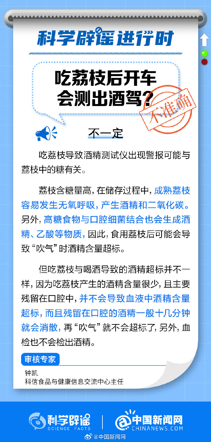 成熟荔枝容易發生無氧呼吸,產生酒精和二氧化碳。另外,高糖食物與口腔細菌結合也會生成酒精、乙酸等物質。但吃荔枝產生的酒精含量很少,殘留在口腔的酒精一般十幾分鐘就會消散,血檢也不會檢出酒精。(來源:科學辟謠、中國新聞網微博)