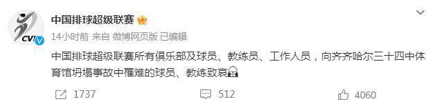 中新網(wǎng)7月25日電 據(jù)中國排球超級聯(lián)賽官微25日消息,中國排球超級聯(lián)賽所有俱樂部及球員、教練員、工作人員,向齊齊哈爾三十四中體育館坍塌事故中罹難的球員、教練致哀。