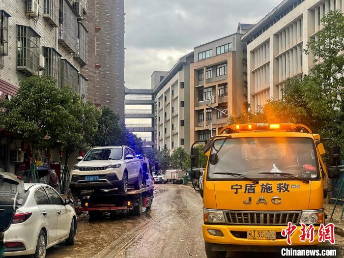 沿著中心街道往里走,越往里,積水退去后的殘留淤泥越多。街道兩側,不時可看見堆放著不少被積水浸泡過后、無法使用的家具、生活用品以及貨物等,救援車將一部部受損車輛拖離現場。