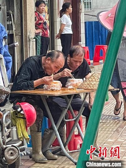 村中,七旬的吳大爺和數名年齡相近的村民,已自發幫助清理村中街道長達11個小時。17時許,吳大爺在街邊攤位吃著面條,稍作歇息后,他將重新投入清理工作。