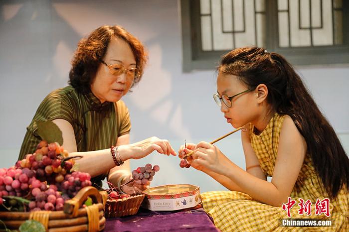 祖孫二人正在做“葡萄常”。中新網記者 翟璐 攝
