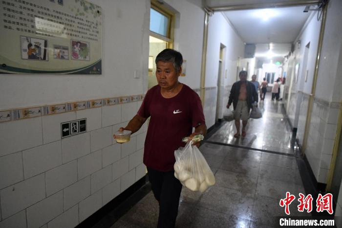 8月1日晚,在涿州市職業(yè)技術(shù)教育中心臨時(shí)安置點(diǎn),民眾剛領(lǐng)取晚飯。 中新社記者 翟羽佳 攝