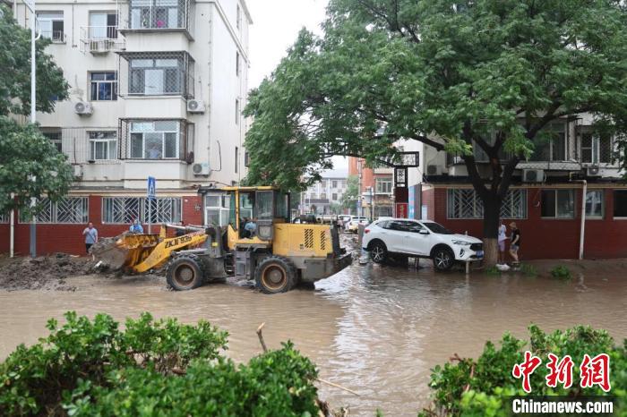 8月1日,北京市門頭溝區(qū)橋東街,工程車輛在街道清淤。 中新社記者 盛佳鵬 攝