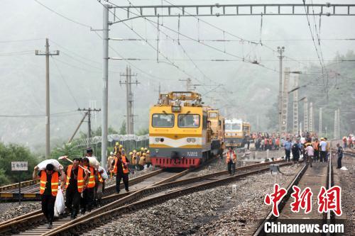 8月1日,北京門頭溝區(qū),豐沙鐵路妙峰山鎮(zhèn)水峪嘴村段,工作人員前往鐵路線清淤搶修。7月29日以來,北京地區(qū)持續(xù)強(qiáng)降雨,西南部降雨量大。受降雨影響,北京豐臺至沙城鐵路(豐沙線)嚴(yán)重水害。 中新社記者 盛佳鵬 攝