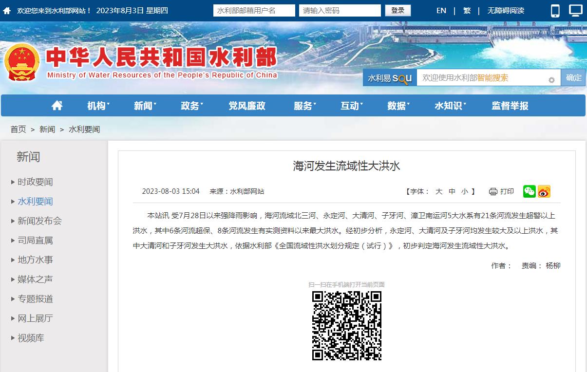 中新網8月3日電 據水利部網站3日消息,受7月28日以來強降雨影響,海河流域北三河、永定河、大清河、子牙河、漳衛南運河5大水系有21條河流發生超警以上洪水,其中6條河流超保、8條河流發生有實測資料以來最大洪水。經初步分析,永定河、大清河及子牙河均發生較大及以上洪水,其中大清河和子牙河發生大洪水,依據水利部《全國流域性洪水劃分規定(試行)》,初步判定海河發生流域性大洪水。