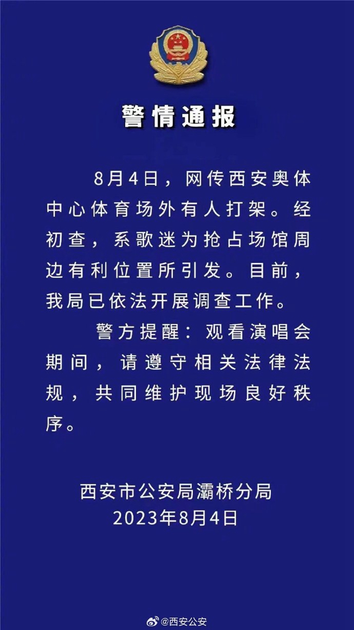 當晚,根據網傳西安奧體中心體育場外打架一事,西安市公安局灞橋分局發布警情通報。