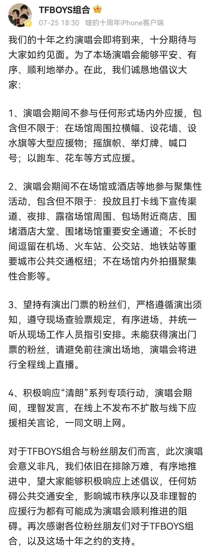 早前,TFBOYS組合官微曾發布聲明,再三呼吁大家一定要理智,尤其提到任何妨礙公共交通安全,影響城市秩序以及非理智的應援行為都有可能成為演唱會順利推進的阻礙。