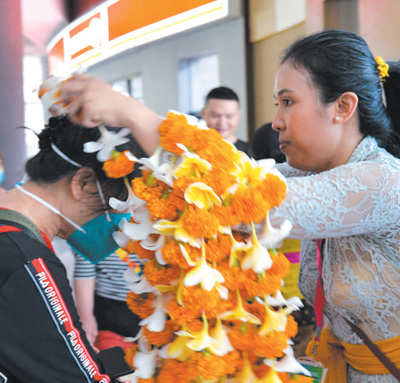 在印度尼西亞巴厘島伍拉萊國際機場,工作人員為中國游客佩戴迎賓花環。