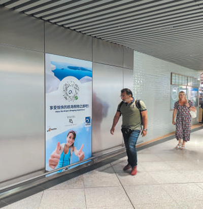 希臘雅典國際機場內,旅客走過用中文書寫的廣告海報。