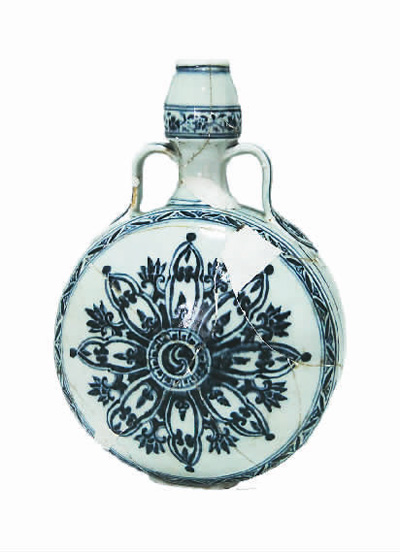 明永樂青花伊斯蘭花紋雙耳扁壺。