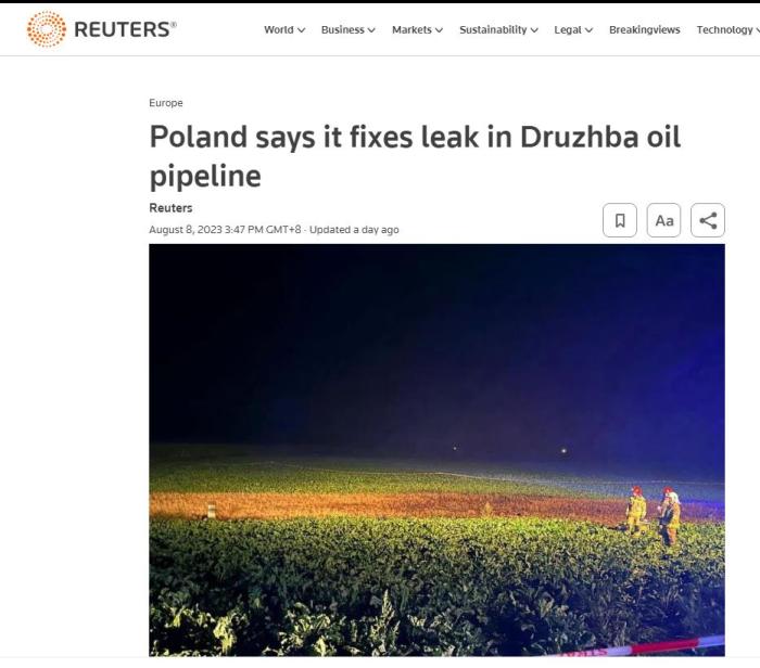 中新網8月8日電 據路透社報道,當地時間8日,波蘭石油管道運營商PERN稱已修復德魯日巴輸油管道,恢復正常運營。