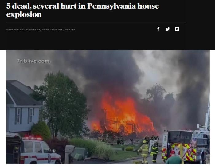 中新網8月14日電 據外媒報道,當地時間12日,美國賓夕法尼亞州匹茲堡附近城鎮普拉姆發生房屋爆炸。警方表示,這起事故已造成5人死亡、3人受傷,多座建筑物受損。