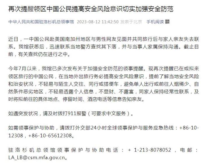 駐洛杉磯總領(lǐng)館領(lǐng)事保護(hù)與協(xié)助電話:+1-213-8078052,電郵:LA_LB@csm.mfa.gov.cn。